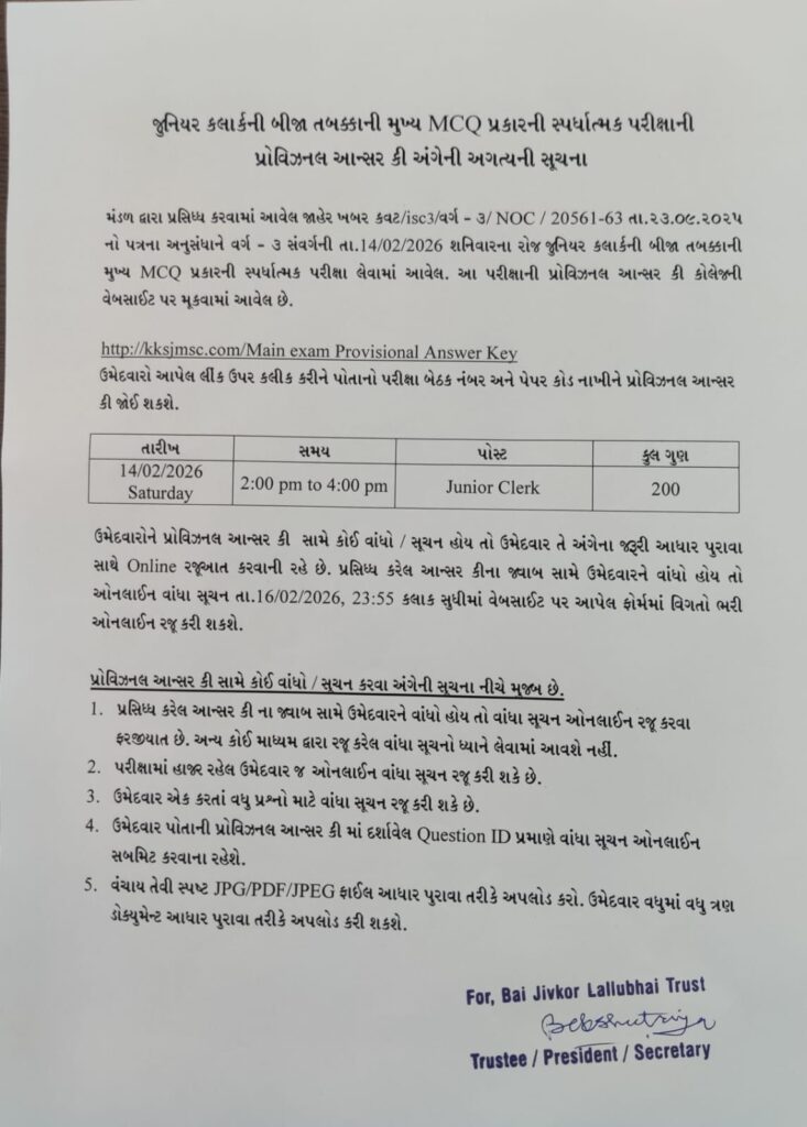 (ઉમેદવારો આ લિંક ઉપર ક્લિક કરીને તમારો પરીક્ષા બેઠક નંબર તથા પ્રશ્નપત્ર ક્રમાંક (A,B,C,D) નાખીને પ્રોવિઝનલ આન્સર કી જોઈ શકશે.)